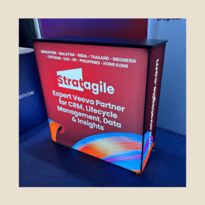 Our portable counters are engineered to give your event space structure, style and practicality — all in a format that travels easily and sets up in minutes. From premium backlit counters that pair with our Enliten Lightboxes, to sleek tension-fabric counters and fast pop-up options with built-in shelving, every model is designed to support real-world exhibiting needs.