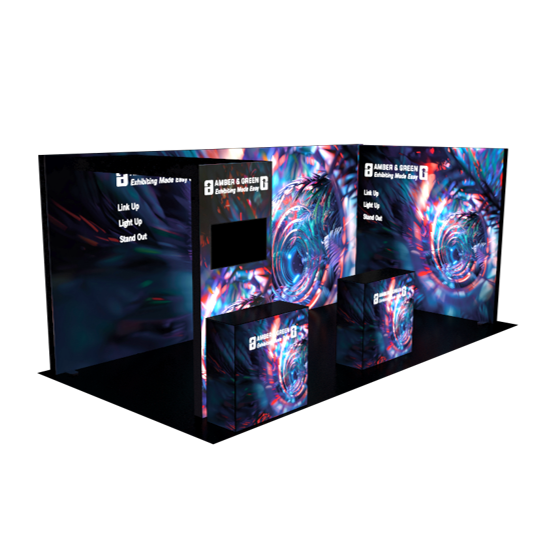 On one side, the backwall connects at 90 degrees to a 2.85m wide lightbox, creating a striking L-shaped corner structure that defines your space and enhances visual flow. On the opposite end, the backwall connects to a dedicated workstation, complete with a bridge header lightbox, a 40” screen mount, and a backlit counter underneath—perfect for laptop presentations or interactive demos.
