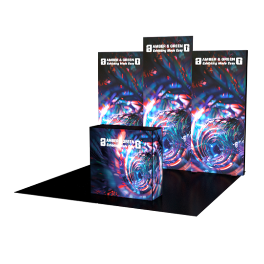 The taller central lightbox supports a 32” screen, ideal for looping videos or interactive content. A backlit counter completes the presentation, offering space for branding, product display, or attendee engagement.