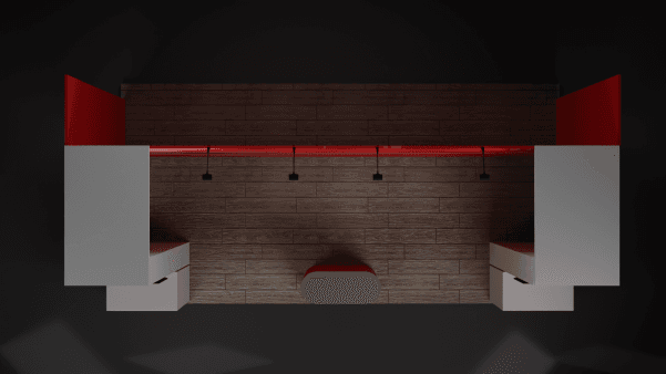 Two Workstations extend out of the backwall at each front corner with a 40″ screen mounted to the booth, and a counter underneath for a laptop.