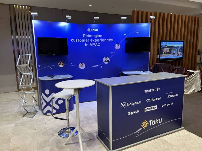 The ISOframe Wave backdrop can be placed in a curve across the corner of a 3m x 3m Shell Scheme booth or used in a straight line on a larger booth.  Additional modules can be added if you need to fill a wider booth space.