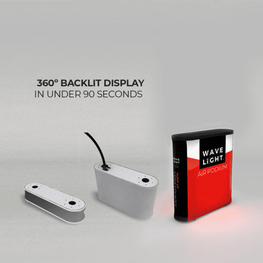 The WaveLight® Air Backlit Inflatable Podium is a double-sided display with bright LED’s that flood the graphic, creating an eye-catching focal point for your branding.